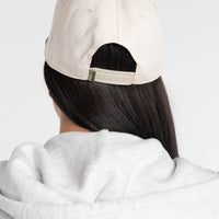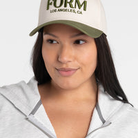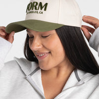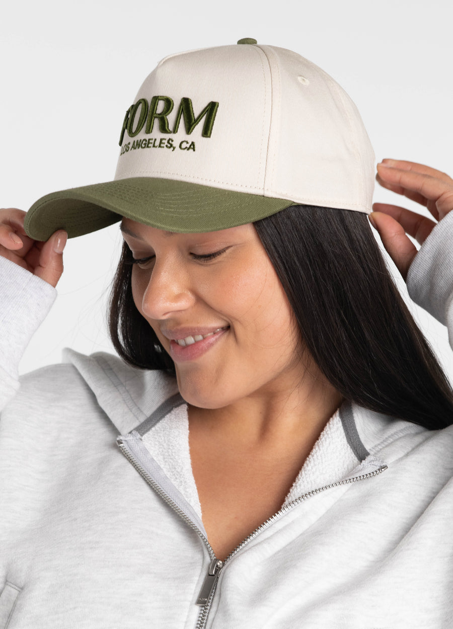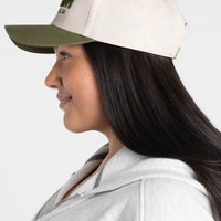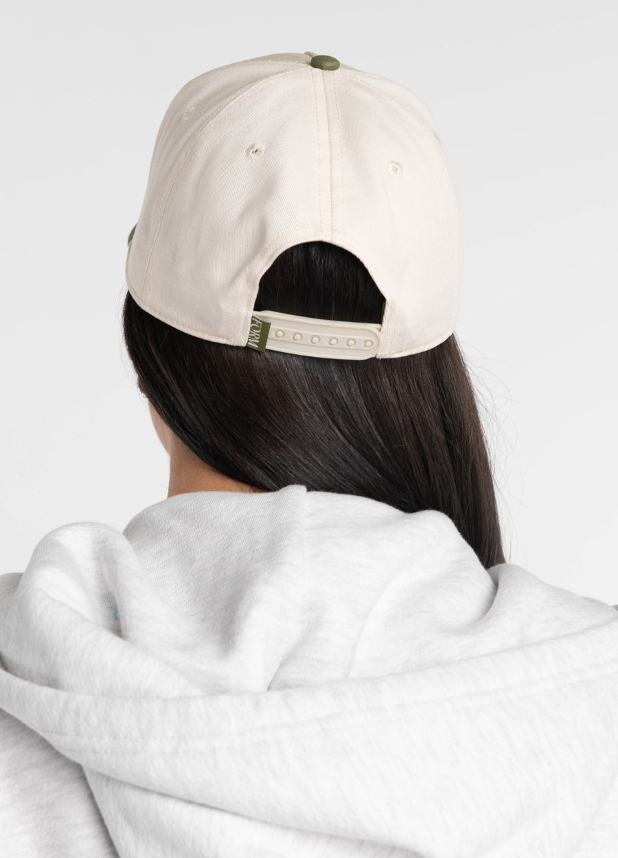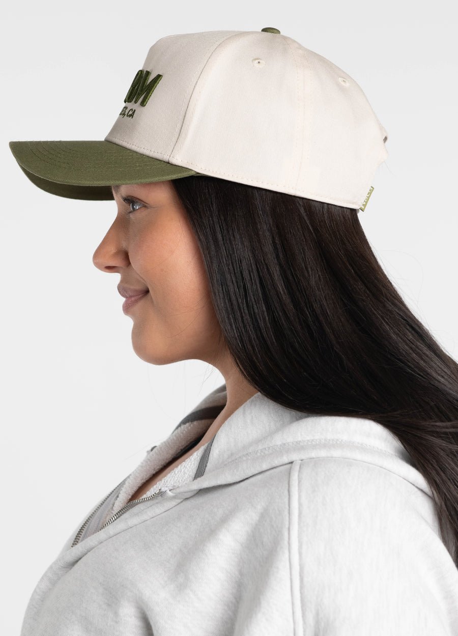 Two-toned with Green and cream. It has a snapback closure with thick embroidery on the front.