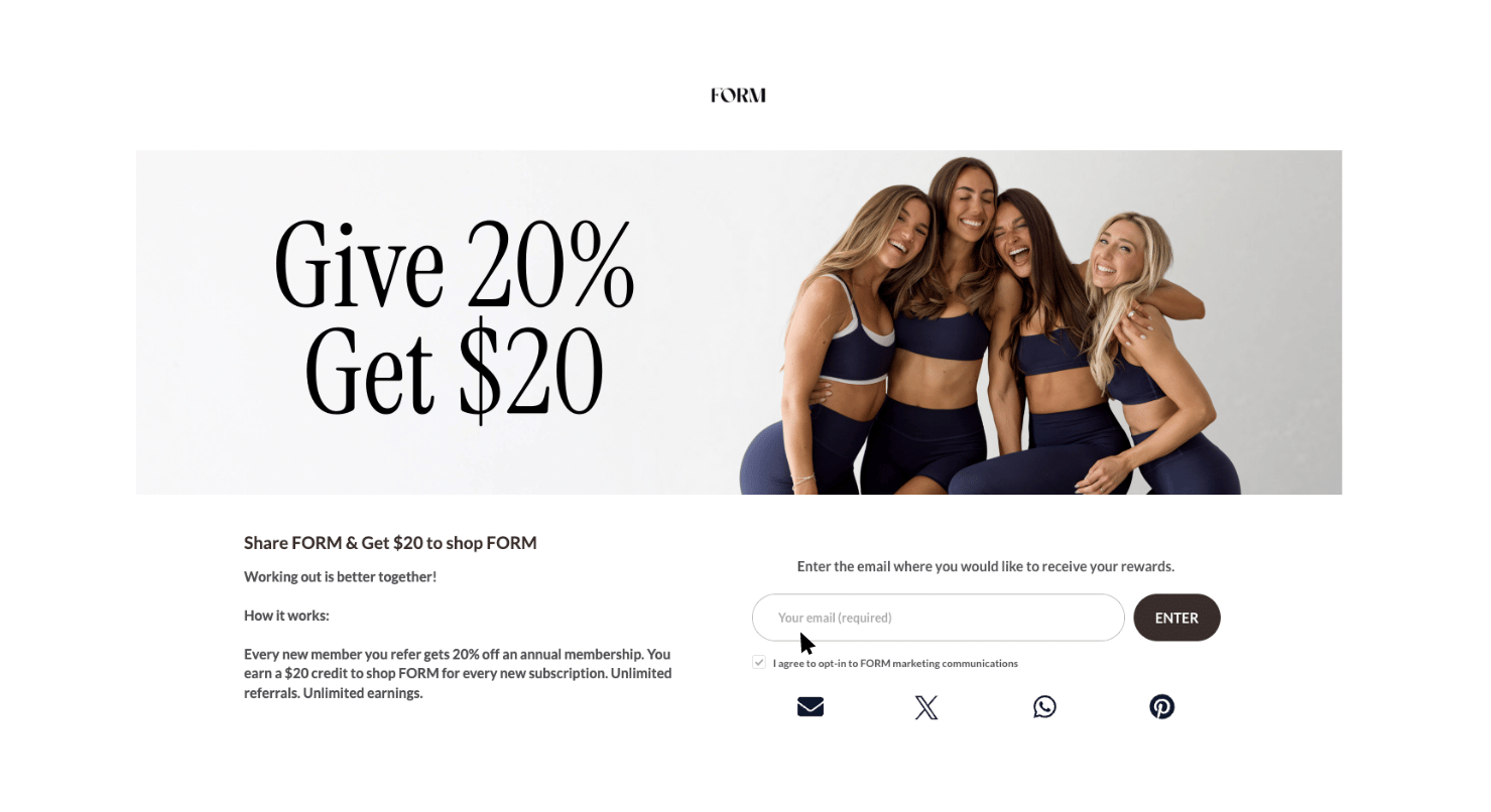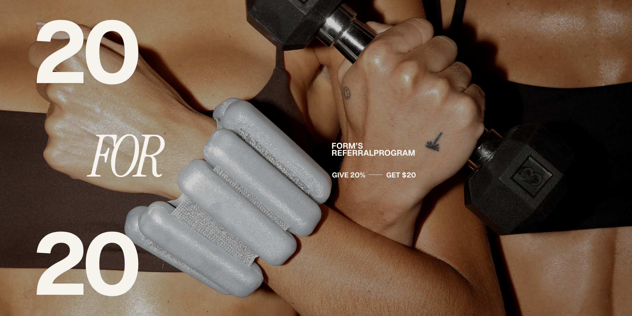 Give 20%, Get $20! Every time someone joins FORM using your unique link, they'll receive 20% off on an annual membership, and you’ll earn a $20 credit to Shop FORM. Even better, you’ll be helping someone you care about step into a healthier, more confident version of themselves.